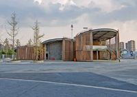 与清冷的混凝土材质搭配的是竹材幕墙,其作为围护界面在共享区、羽毛球馆、综合竞技馆的外立面大量采用,给整个群体建筑带来温暖的质感和氛围,也是该项目中的一大亮点。这些竹材幕墙固定在钢结构或龙骨间,既起到了遮阳的作用,又有明显的通风效果。同时,我们尝试用砌块砖头的形式,把所有拱形场馆进行分类,可以作为游泳馆、羽毛球馆、校舍等,当游泳池里装满水后,拱形屋顶倒影在水里,会形成一个圆,就好像从望远镜里看城市。