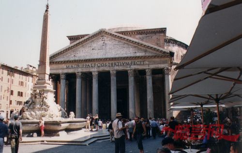 这个供奉罗马全部神的万神殿曾被米开朗琪罗称赞为“天使的设计”。这是于公元前25~27年阿古利巴建造的。它正面的8根圆柱让人联想到古希腊建筑。这栋建筑藏在一条狭窄的街巷中,外观不太显眼,可当你一进入室内,你马上被这巨大的圆形空间所震撼,让人仿佛进入一个庞大的观象台和航天大楼空间,周围除了入口并没有一扇窗户,而尽是不同的神像雕刻。内部圆形屋顶上开有直径9m的天窗,自上下泻的光线照亮了室内每一个角落,从这里透进来的光线照射在马赛克的地面上,有一种庄严、肃穆的气氛。