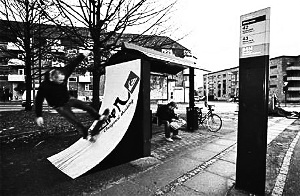 这款位于丹麦哥本哈根街头的公交车站,想必是一位极限运动爱好者设计的,匪夷所思的创意中带着疯狂。不过,在这里玩滑板千万得小心,万一“出轨”冲到了车道上,那就麻烦了!