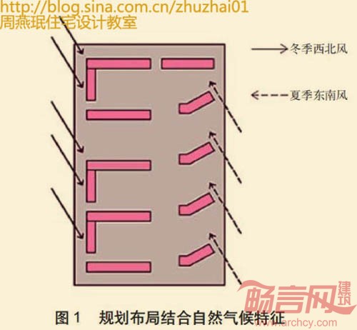 由于我国相关配套技术尚不够成熟,政策法规也不甚健全,节能省地、可持续发展等概念在很多开发商看来与己无关。为尽量降低建设时的成本,除了满足有关部门规定的节能系数以外,很少有人主动在楼盘的节能、省地等方面有更多地考虑。其实,节能并不等同于用高级设备、高成本造价,采用一些成熟的技术手段,在建设成本增加不多的情况下,同样可实现节能环保的目的。如在规划设计中,尽量保持套型的南北通透,就可以有效利用风压实现户内的自然通风,在夏季可以大幅度减少空调的使用;减少纯西向套型的比例,或用绿化遮挡,可以避免这些套型在夏季因西晒带来的高温,进而减少空调的负荷。如图1结合地段的自然气候特征,将小区的楼栋布局为东南向敞开以引入夏季的东南风,西北向封闭来阻隔冬季的西北风。