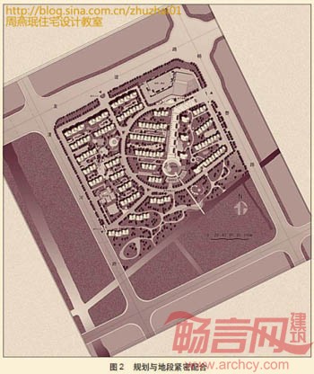 规划和套型设计都要与具体的设计地段紧密配合,为此我们总结出居住区规划设计与地段配合的三个原则:量体裁衣、见缝插针、疏密得当(见图2)。