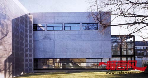 在威尔•阿瑞特(Wiel Aret)的作品上也同样可以发现风格派的痕迹,在赫尔宁的AZL保险公司总部办公楼(AZL insurance company head office in Heerlen 1995年 图16)中,那些混凝土楔形块给人的感觉是:尽管这幢建筑物是由沉重的体量所构成的,但它是漂浮在空中的。此外,他更看重表皮的独立性和完整性,我们可以在马斯特里赫特的艺术与建筑学院(Academy of arts and architecture Maastricht 1993年 图17)中清楚地看到这一点。为了不损害体量的几何感,他不仅省略了屋顶檐口,而且也不允许学院中的那些门来破坏表皮。那些引向新建筑物的门以及在第四层上引向屋顶平台的门,除了一个简单的涂黑钢框之外,看起来就像是完全用混凝土做的。模板的接缝以及间隔孔洞所特有的网格,甚至都延伸到了这些门上,这就使得这些门并不只是孔洞的填充物而已,更是墙面的延伸。以这种方式来伪装这些门,就解释了为何他通常会选择旋转门或推拉门。毕竟,“常规的铰链”会显示出门的存在,而旋转门的枢轴或推拉门的导轨可以被整合进门自身的表皮之中,从而消失在人们的视野中。(未完待续)