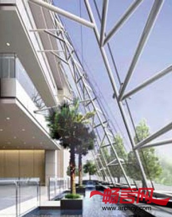 g、屋顶露台由钢和铝的支架结构所覆盖,它同时为屋顶游泳池及顶层体育馆的曲屋顶(远期有安装太阳能电池的可能性)提供遮阳 和自然采光。