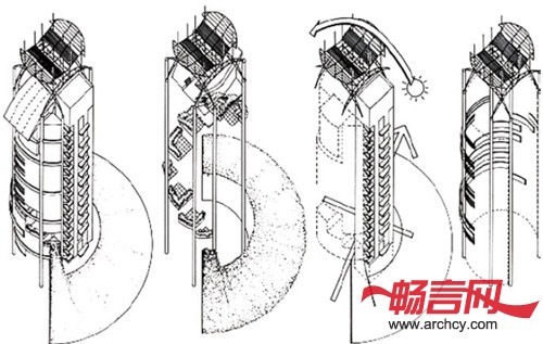 a、空中花园从一个三层高的植物绿化护堤开始,沿建筑表面螺旋上升。 ( 平面中每三层凹进一次,设置空中花园,直至建筑屋顶)。