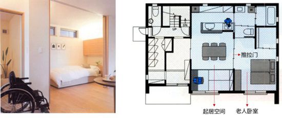需要照料的卧床老人往往希望与家人有更多的交流来减少孤独感。日本两代居在空间布局时多将需照护老人的卧室与家庭起居空间邻近布置,同时在老人卧室与起居室之间采用推拉门相隔,需要时可将推拉门打开,使老人卧室与起居空间有较好的视线联系,方便家人在起居活动的同时照顾老人。