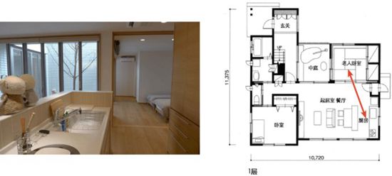 部分两代居中还将老人卧室与厨房等家务空间相邻布置,使家人在进行家务劳动时,可以随时照看到卧床老人。