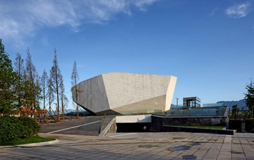 此时建筑已经不是主题,而是起烘托和补充作用的背景,建筑的位置也退让到幸福园的一个小角落里。尽管已经很小了,我们还是希望能把被建筑占掉的城市广场空间还给城市,最终决定把建筑主体放于地下,将屋面设置成一个缓坡,和幸福广场融为一体,一气呵成,像掀起幸福之地的一个角。羌族民居通常习惯在屋顶放一些白石,表示祈求平安幸福,我们最终把这种抽象的白石搁在这里,恢复了一个广场,增加了一个白石,为新北川的未来祈福。