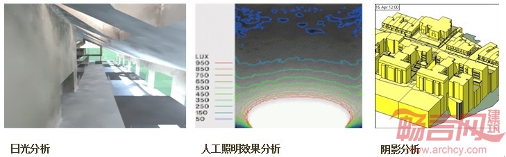 日光与阴影模拟,预测建筑内外的日光与阴影状况,充分利用日光,节约照明用电;