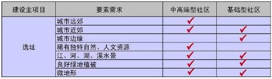下表列出了高端型和基础型养老社区在选址上建议考虑的各种要素。