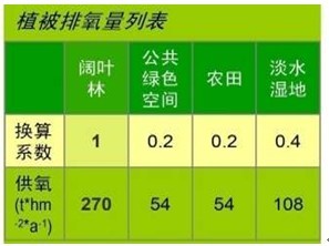 目前住区规划中,较常采用的是富氧植被组合法,既根据各种不同植被每公顷能提供的氧气量值来进行植被搭配。下表为植被供氧量值。