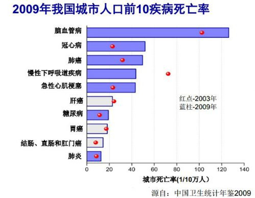 我们对2009年以前由于空气污染造成的死亡率做了一个统计,这是全国排在前十的疾病死亡率,从中可以看出来,十个中有七个是和空气污染相关的,随着时间的增长,数据增加得很快。
