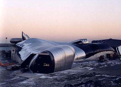 实际上,这个形如搁浅的鲸鱼的主题公园有两座帐篷,另一个是Kas Oosterhuis 和llona Lenard 以及 Menno Rubbens设计的Salt Water Pavilion,就像他的Trans-Port项目,Oosterhuis的帐篷相对简单,可延展的容器包含了旋转成为“无穷”符号形状的循环路线。而且,一座叫Hydra的雕塑(九头蛇),在中央盘踞,即作为支撑结构,又作为信息传递工具。被雾、雨、流或浪围绕,由中心计算机控制的多彩的视觉光纤和多媒体效果改变了周围环境,对参观者起反应。