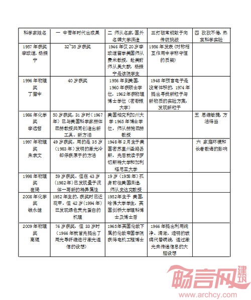 不久前,有人总结分析外籍华裔科学家获得诺贝尔奖的主观缘由(见《西安交通大学学报》2010年4期)得出六条经验:1中青年时代出成果;2师从名家、国外名牌大学;3打破常规敢于向传统挑战;4孜孜不倦热衷科学实验;5思维敏捷、方法得当;6家庭环境和长者教诲的影响(详见上表)。我认为,这些方面的作用在钱学森成长历程中均有所体现。因此,研究、借鉴钱学森的成长经验有益而且必要。这一研究似应列为“钱学森学”研究的重要课题,如此方能更全面准确地回答“钱学森之问”。