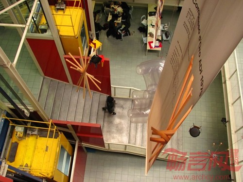 米兰理工大学的建筑和设计两大专业于上世纪后期进驻Bovisa,形成了设计与艺术相融合的局面。设计学院虽名声在外,但校区大门却出奇的小,一不留神就会错过。大门进口处设置了接待中心,内有学生作品出售,别具特色。设计学院教学主楼中央设有一个增进交流和互动的巨大中庭,为配合设计展,该门厅精心布置了设计名家作品展,以悬垂的方式将一个个经典创意作品错落有致地悬吊于空中,其大胆独特的色彩和造型令人耳目一新,也大大提升了学院的凝聚力和创造力。
