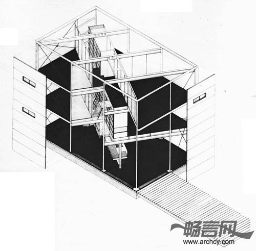 他们一直致力于拆散在建筑构件上的设计,将那些复杂的要素(基础和楼板、主要支撑结构、外壳、设备和室内)分解为更小的部件,这样就更加明了这些部件的功能,从而可以废弃那些多余的构件,同时还能在这些单独构件的具体功能的基础上对这些要素进行改进,例如代尔夫特的“两幢没有屋顶”的住宅(“two without a roof”house in Delft 1989年 图18)。
