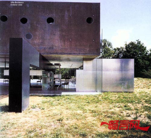 在大都市建筑事务所(OMA)的作品中,呈现出一种有组织的无秩序,这是由于他们确信完美是极度无趣的,并且阻止了能引起强烈争论的意外事物的发生。“如果细部处理在从前提出的是要将那些完全不同的材料聚合在一起的话——或许是永久性地聚合在一起——那么,它现在就是一种短暂的耦合,等待着被解开和松开;不再是对差异的有组织遭遇,而是一种僵局、一个体系的突然结束。”因此库哈斯提出了“非细部”(Non-Detail)的概念,在其中似乎实现了一种材料与另一种材料之间完全连续的转变,材料似乎被互不干涉地并置在一起,使得体量感占据主角。另一方面,“非细部”就是消失了的细部,或者更准确地说,是未经设计的细部,它们不是建筑细部。在波尔多别墅(Maison á Bordeaux 1998年 图19)就显示出在概念、完美和不完美之间的一种强有力的平衡。这幢别墅几乎不能说是精美的或是柔性的,它是一个粗野的、但同时被极为巧妙地建构出的概念。一个看起来坐落在玻璃体量顶部的非常沉重的褐色混凝土盒子,控制了建筑物的形象。墙上的那些窥视孔,只是没有细部的孔洞而已,而且排列方式看起来是完全随意的。事实上也基本如此,这些孔洞并非用以形成立面的构成。这些孔洞的引入,只是由于那些房间需要光线,或在这些位置上需要一个视野而已。