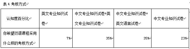 由于双语教学在国内是一种新生的教学模式,对其体系的评价就显得十分重要。课程结束后要对学生进行问卷调查,跟踪不同教师、不同教学方法的效果,了解学生多双语教学的兴趣度与认同度的反馈。这个问题笔者将在另一篇系列论文中系统讨论。这里要提一下对学生的评价,表4显示了多种学生课程的考核方法,大部分师生认为双语试卷是首选,专业知识以中文为主,穿插英文的语言试卷及专业知识试卷。