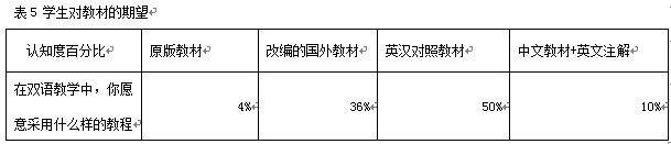 要实现双语教学,教材是关键。它是双语教学的基本保证。目前各高校在双语教学的教材选取方面,按照英语所占的比例,大体分为原版教材、改编的国外教材、英汉对照教材、中文教材四种。原版教材是大多数人第一个想到的。但原版教材内容与深度、章节的编排顺序及其知识点的逻关系以及学时数与我国目前的教学体系存在着一定差异。如果没有中文注解,原版教材中的专有名词和特殊用法会令学生不知所措或理解错误。而且大部分原版教材章节编排比较随意,不拘形式,而中文教材一般讲求章节编排归类划一。中英文教材的章节编排顺序有所不同,国内教师使用英文原版教材教学时常常需要调整某些章节的顺序。而英汉对照的教材又会使学生过分依赖母语翻译,忽略了对英文部分的学习。表5中对教材的调查中显示大部分师生愿意采用有中文注释的国外教材。