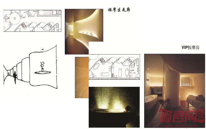 沿用上面介绍的方法可以对平面图的一些重要局部进行放大说明,并配以图片和草图。上图为按摩房及其走廊的说明。
