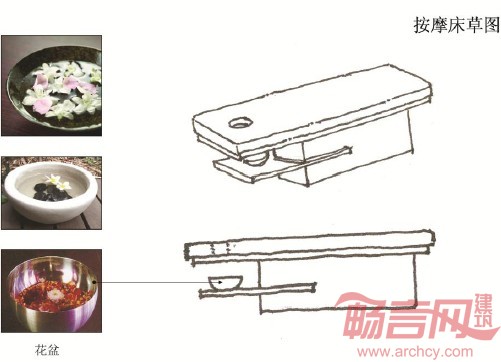 根据方案设计的深度或者甲方对某些细部节点的关注,可以深入地剖析某节点的设计细节。下图为按摩床的草图、结构体系及装饰物的图片说明。