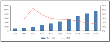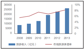 根据国家旅游局发布的数据,2008 年-2013 年中国旅游行业总收入复合增速达到20.5%。预计到2020 年,国内旅游市场将达60-70 亿人次规模,收入约为10 万亿元,年均复合增长率分别达9%-11% 和19% ;入境旅游市场约为2 亿人次,收入约为800 亿美元,年均复合增长率分别为6.5% 和6.4%。在旅游市场强劲的增长态势下,旅游地产的前景颇为可观,旅游市场的O2O 业务也被寄予厚望。