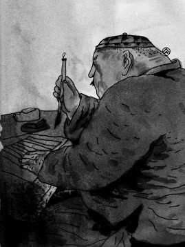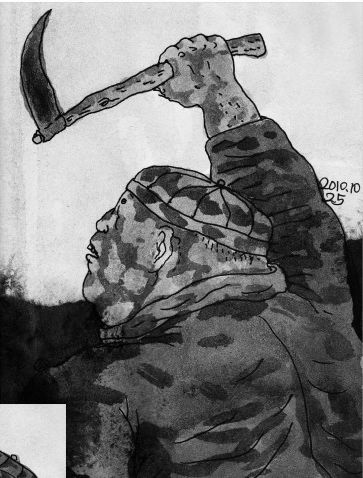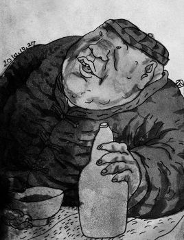 这就是,在他作品中表现出来的那种极为复杂多变的人类精神的依托和情感的表达形式。头上戴的瓜皮帽子,鼠目寸光的绿豆小眼睛,大面积黑色褶纹,手中的工具,画面中被挤压扭曲变形的形体块面,老式宋体的文字把“地主”于“土地”的戏剧化纠结情节表达的似一部史诗。