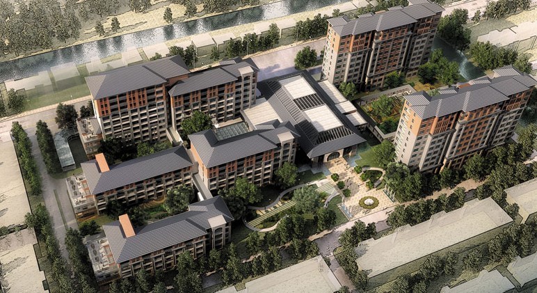 此项目是典型的CCRC老年社区,整个用地100多公顷,建筑面积60000多平方米,是完整的别墅社区开发最后一块用地,开发商有做老年社区的想法,所以增加开发了这个CCRC。项目总平面上来看,包含独立居住、护理居住区。有两栋老年公寓、半护理公寓、小型卫生院、全护理的公寓。床位接近500床,是为老年人服务的综合体。这是一种体现居家生活、娱乐健身、酒店服务为一体的养老社区新模式。设计特点是: