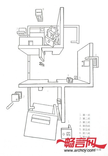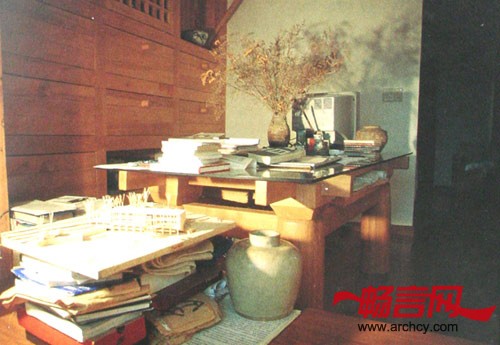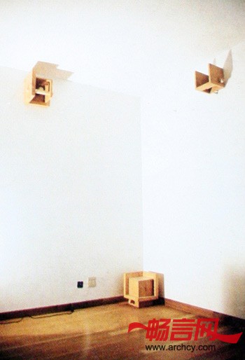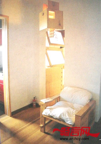 “但它也是一张好桌子,对中国文人来说也许更加好用,下面掌灯,桌面铺开八尺生宣,即兴的书写,清晰可见笔墨的渗变和流淌”。全屋唯一的一把椅子是按风格派的样式设计,它暗示着是一个可以坐的建筑,联系着园林中客厅和院子的关系。 八盏木制的灯具被王澍描述为八间不能居住的房子,这八盏灯具有着同构异质的特点,彼此拥有相同的内胆却不同的外壳,它们被匀质地安放在住宅的不同角落,放大的用料尺寸和夸张的榫卯构造有意模糊建筑语言与灯具语言的边界,这使得灯具与“桌房”“椅房”有着同构的关系。将灯具比拟成房子的另外一个目的是消解建筑语言的等级性,“没有那样东西是真正次要的,每一个细节都举足轻重”,这是对我们习以为常的建筑认知体系(从总平面开始,从功能规范开始的一种从大到小的等级观念)的某种颠覆,而这种颠覆,恰恰是园林所应具有的精神特质。