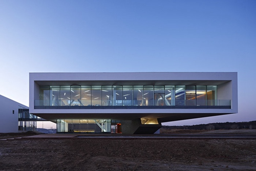 在剖面上,倾斜25度的方形盒体以一种坚决而略显“生硬”的方式贯穿建筑的首层、二层和屋顶,在每一层的空间内现浇混凝土盒体的转角都直接暴露,呈现出一种形体上的冲突。 同时为了给这个封闭的承重结构增加通透性,楼梯盒子的混凝土围合面上设置了150个贯通壁厚的,大小方向不一的椭圆形洞口。悬挑以下的空间作为公共空间,被以各种方式加以利用。