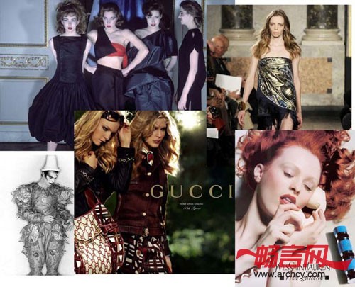 新西兰信息报是这样形容美国 70 年代末到 80 年代初的风格的: 你可以在纽约找到那个时代的全部特征,人们喘着热气,沉浸在快乐主义的哲学中,身穿线条优美的紧身拖地长袍、乡村宽大衬衫、戴着闪耀的珠宝、头发上别着大朵的鲜花,带着宽边草帽。如果你要列一个体现 70 年代魅惑特征的清单,那就看看古琦(GUCCI) 、斯特凡诺·皮拉蒂(Stefano Pilati)与伊夫·圣·洛朗(Yves Saint Laurent)这些高档的奢侈品品牌的产品吧!(见下图)