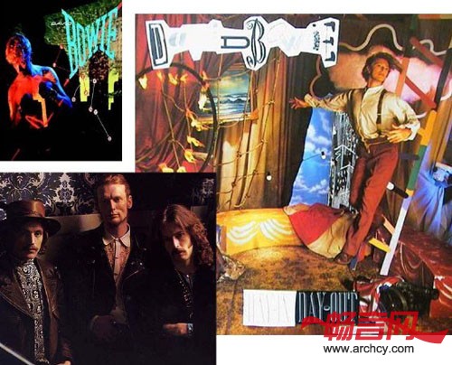 再看看那个时代的代表人物戴维鲍伊(David Bowie)吧:60年代末期出道的大卫鲍伊被称为摇滚变色龙,因为这位老兄的音乐理念游走于民谣、迷幻、庞克、摇滚、电子乐,并结合电影、舞台剧,与佛学概念、超现实主义。大卫鲍伊是70 年代摇滚的象征,舞台上炫耀的中性装扮堪称为今日视觉系宗师;他的歌传达了内心深沉失落的感情与肆无忌惮的幻想。(见下图)