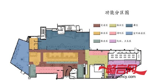 影响一个室内空间风格的因素除了使用者的个人喜好之外,还要尊重建筑所处的地理位置以及现状特点。这些因素对于公共空间来说更加重要。 名利场(Vanity)俱乐部占地 14000 平方英尺,形态特殊,极具设计挑战。空间还横跨两幢建筑 (原硬石酒店与新造的硬石南塔),造成地板和天花板高度不相一致。面对这一难题, Mr.Important认为应当尊重新旧两幢建筑的不对等性并加以巧妙利用,但如何应对旧建筑中相对较低的天花板空间和新旧两建筑地面的高度差成为设计的最大难点。下图为名利场(Vanity)俱乐部的功能分区图: