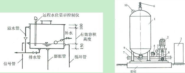 在工程中,应优先采用高位开式膨胀水箱,因为它运行时无需消耗电能,工作稳定可靠。图(4-1)为膨胀水箱结构示意图,图(4-2)为气压罐结构示意图:
