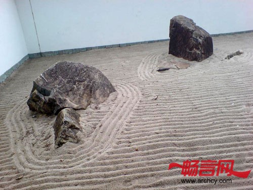 在厅室或内庭中,常以一块孤石或几块山石作成一组石景,以少代多,以小见大,留有想象的空间,形成抽象山水。如有些日本园林的石组是以一种没有流水,又要创造一种表现恰似流水境界的做法。通常是把瀑布石组中的镜石去掉,对石组进行抽象简化,再点缀少量的灌木或苔草。用山石和白砂为主体,用以象征自然界的各种景观,山石的配置很少用石块叠成假山,一般多用土石或石组。在其特有的环境气氛中,细细耙制的白砂石铺地、叠放有致的几尊石组,就能对人的心境产生神奇的力量。这种手法对组群、平衡、运动和韵律等充分权衡,其总体布局相对协调,以至于稍微移动某一块石便会破坏该庭园的整体效果。这里的主石,或直立如屏风,或交错如门扇,或层叠如台阶,其理石技艺精湛,当观者远眺时,其理石技艺精湛,分明能感觉到“水”在高耸的峭壁间流淌,在低浅的桥下奔流。此外还有许多用石的方法,如石灯笼、飞石、泽飞(水中步石)、水手钵、石桥等(见图9、10)。
