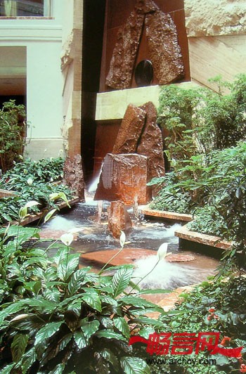 在一些较为现代化办公楼内庭中,点置几块巨石,尺度大简洁明快,再配几株植物,与开敞简练的办公空间极为协调。这虽不是山的造型,但却给予了我们新的启示,我们完全可以在传统程式中寻找隐含的现代意味,有意识地抓住这一点,并穷极发展,创造柳岸花明的新局面(见图11) 。如某大厅空间的山水造型就是运用了抽象的、概念化的形式来象征自然界的山水。在中庭巨大的背景墙上采用石墨、大理石和石灰石雕成了十八米的雕塑,以抽象的手法象征山水景观(见图12)。