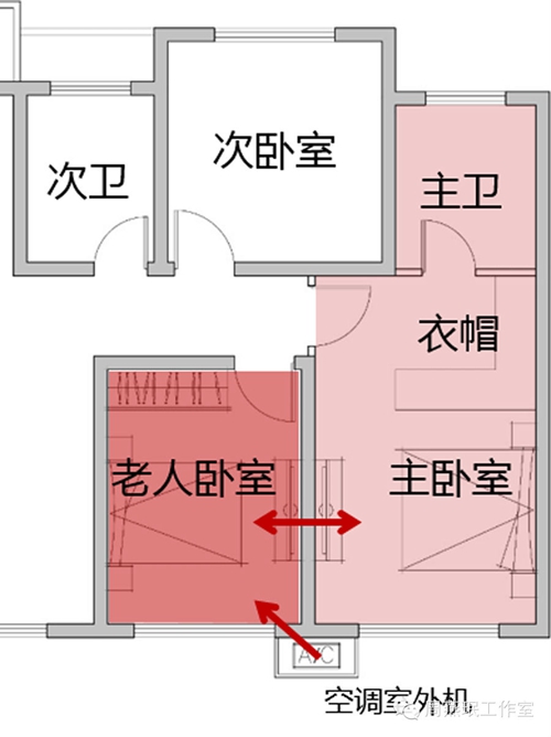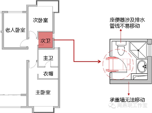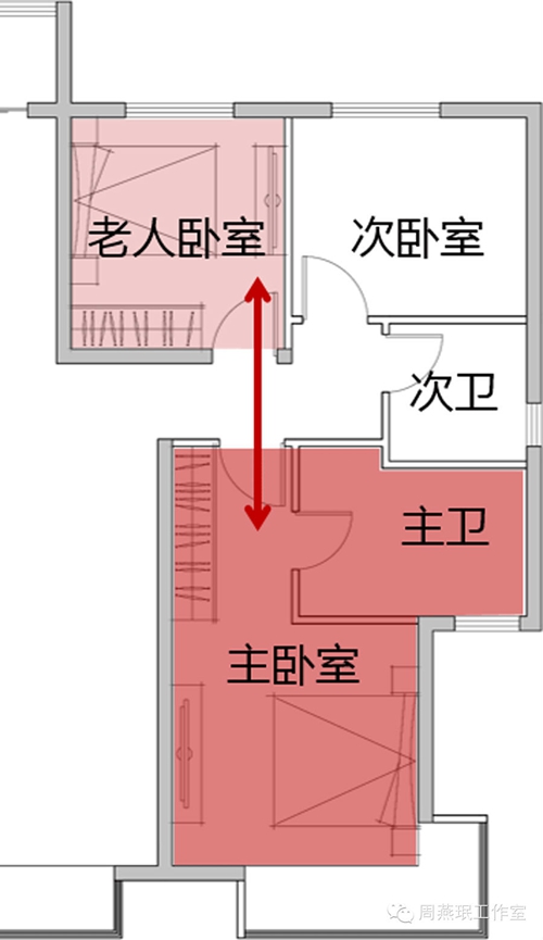 在三室二卫的套型中常有将一个次卧室单独布置在靠近入口处的方式,一般家庭也会将这个朝向好且独立的卧室作为老人卧室。但为了卫生间的通风及管线等问题,设计时仍会将次卫与主卫相邻布置在一起,导致次卫与老人卧室距离较远,不便老人夜间使用。
