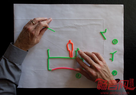 CD:由于建筑师需要绘图,因此人们都认为这是一门依赖视觉的职业。我持不同观点。建筑首先是一门创意行业。建筑师思索、考量、调查、研究,通过绘图和模型制作方式建立形状。如果我们不能看到面前的图纸和显示器,如何能创造建筑?多数人都依靠视力在街上走路,但视觉受损的人必须找到非视力的技巧。这一事实适用于包括建筑在内的许多行业。