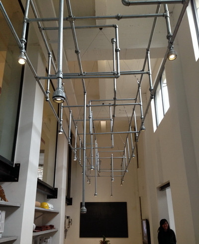 再有就是材料,我们没有把材料所有的都做得特别的干净,而是希望这个材料本身有它一定的复杂性。材料和空间都是相对自由的,但是同时在使用过程当中也是异化的。我们用亚克力嵌入在水磨石中,形成缺角,做成这样的space空间。里面有钢板的楼梯,嵌入到整个的体块当中,等等这些都是材料的异化。此外我们还把水管做成了灯,水管里面本来是流水,现在里面流的是电是光,这个水管灯其实也是对材料本身的再利用。所以我们小小的一个工作室,一千平方米不到,但是在设计过程中,我们在探讨设计的一种自由的状态,希望我们像一个挖掘者一样,能够把既有建筑当中,已有的这些诗学的内容能够慢慢地呈现出来。