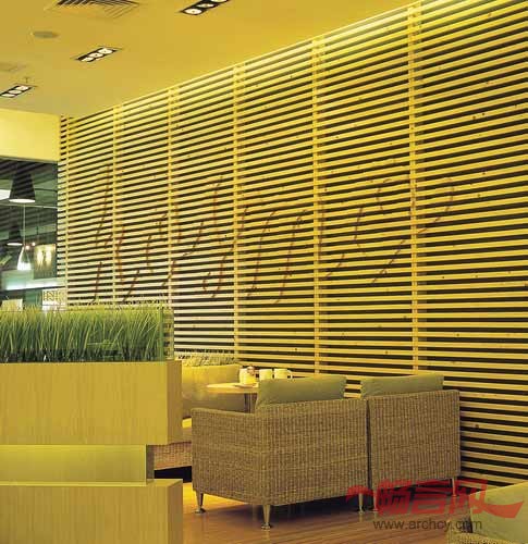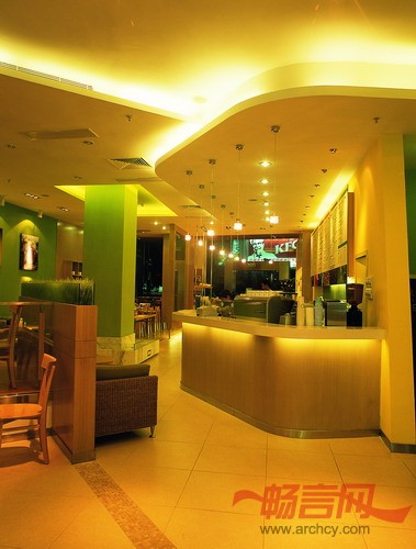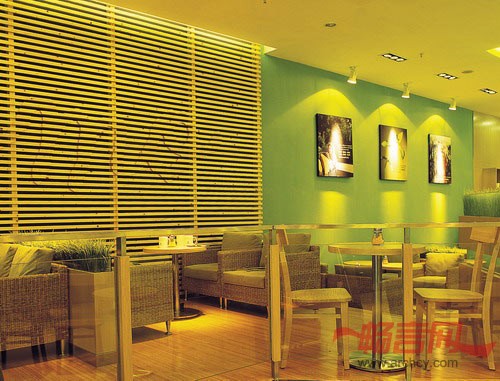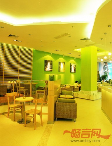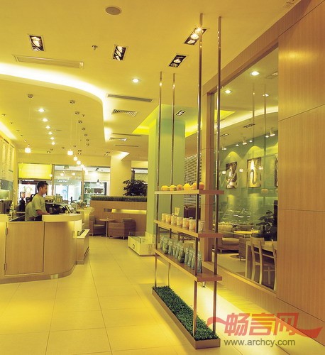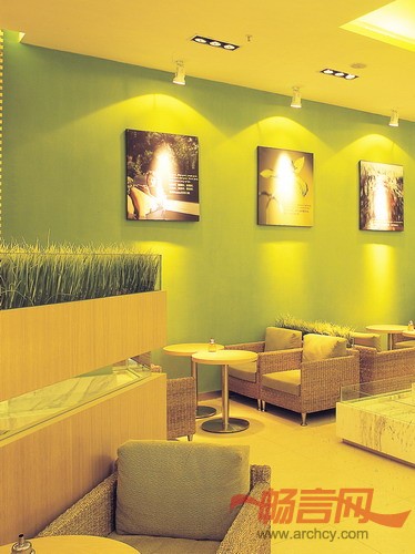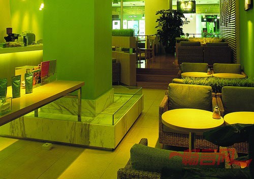 我们知道品牌强大的奥秘就在于对品牌核心价值的精确定位和对细节持之以恒的坚持。可以将之称为:集中集中再集中,坚持坚持再支持。因此,KOSMO在质材与色彩的处理上,将原木的健康自然与草绿的柔和,品牌的标志性符号“小麦草”的反复运用,从而达到强化品牌意念的作用。考虑到给顾客不同的体验,在功能布置时设置了几个不同功能的区域,入口处是原木地板和天花,临靠着落地玻璃的橡木坐椅更添一份自然。在这里可以享受到阳光和自然。在中间区域还设置了阅览区,在这里可以选择自己喜好的音乐,翻阅关于健康生活的杂志和书籍,并设置了无线上网设备确保顾客能更方便地进行信息交流。最靠里面安排了宽大舒适的沙发,顾客可以尝试放松自己的心情,选择自己最舒适的坐姿。或聊天或细细体会所提供的天然的食物和饮品。错落其中的是一些健康产品的展示台/架,意犹未了之际带走一些有机食品也不失明智之举。