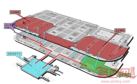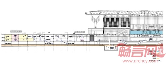 从剖面透视图中可以看出,不同标高位置的交通设施正在通过立体化的换乘设计,实现高效集约的城市功能:公交枢纽和地铁之间的地下一层作为“城市夹层”,被设计成一条步行商业街,发挥着良好的人流疏散的同时,也加强了都市商业的密度和效率。