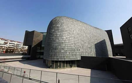 二是由日本建筑设计大师矶崎新设计的中央美术学院美术馆。由于形状奇特,这个坐落在北京花家地的新建筑被人们戏称为“鲨鱼”。相比于望京近年来接连拔地而起的高楼,这条“鲨鱼”可谓“潜水甚深”,完全融入周遭的一片灰色建筑群之中。美术馆造型沉厚而稳重。它的外型由三块自由弧面架构而成,从刚性石材透出柔性的关怀。室内空间舒阔,展厅最大空间高度为10m;展厅内自然光与人造光混合使用,具有浓重的现代色彩。该馆建筑面积15,000m2,其中展厅面积5,205 m2,画库面积1,400 m2,报告厅面积485 m2,是目前国内最具国际化水准的新美术馆。该馆堪称精心设计加之精心施工的建筑珍品。它由上海建工承造,该馆曾获得“2008年工程建筑长城杯金奖”。