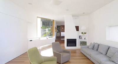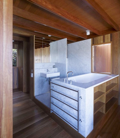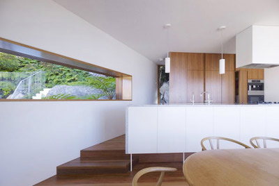 这是一栋多代家庭度假用住宅,建筑沿斜坡呈阶地状布置,共三层:儿童及祖父母居住在较低层;主要的生活区位于中间层;父母居住的“私密性”木质小屋位于顶层。建筑师将住宅平面分层,使每一层都不同于其它层,内部楼梯也被隐藏起来。住宅每一层的天花板都是一样的,地板则呈梯状或者配合“地形”。
