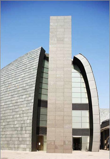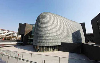 中央美院美术馆由日本建筑大师矶崎新(ARATA ISOZAKI)设计,新的美术馆位于望京花家地南街8号中央美院内,校区用地的东北角,建筑占地面积2475 平方米,总建筑面积14777平方米,建成后的美术馆为地上四层、地下二层的框架结构建筑,将按层划分功能区,其中地下二层主要用于机房、库房,研究室、 制作室也设在地下,可方便工艺流线操作;一层主要是大厅、报告厅、咖啡厅、会议室和休息大厅;固定展位厅设置在二层,一部分将用于展示古代书画和美院老教 授的赠画藏品,另一部分展示当今美院在籍教授的作品;活动展厅设置在三层及四层,超过10米层高的活动展厅可为当代艺术展览提供更多的可能性。预计2008年6月投入使用。