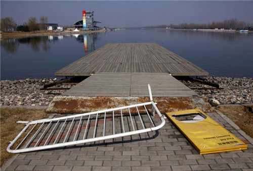 5、2008年奥运会划船比赛前场地,一块旧的奥运资格认证牌被随意丢弃在无人维护的码头边。
