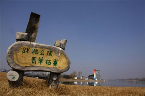 7、废弃的游戏划船比赛前场馆,写有“践踏会使青草枯萎”的标志牌竖在荒草萋萋的草坪上。