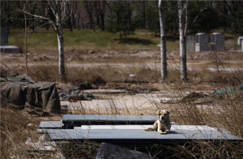 8、一只流浪狗趴在场地中随意放置的玻璃板上,这片场地曾是2008年奥运会棒球比赛场的一部分。