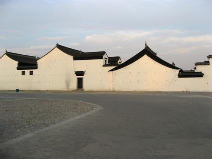 这应该是个大户人家的房子,层层叠叠颇有气势地在空地上形成一个个三角、方块。一条简单爽快的黑线从它们顶上掠过,把这些方块、三角稳稳地规定在苍穹之下。最强烈的色彩对比、最基本的几何形状、最原始的材料和手段,亲切朴素却异常现代和有张力,宁静人文却不费吹灰之力。我不禁妄想:为什么苏州博物馆不是在这里面呢?
