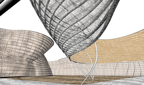 “藤编的篮子,在概念中可以包容很多东西,不同文化的人可以在里面交流对话。而藤编也是中国和西班牙传统所用的材料,在西班牙各地考古中都有发现,是中西文化融和的桥梁。”建筑师说,“篮子”完工后展厅面积可达8000m2,自然光透过钢管和柳条射进室内,室内用竹子和半透明纸作为材料,顶部则使用太阳能板。