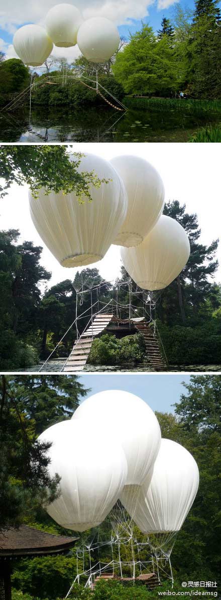 法国装置艺术家Olivier Grossetête的作品“Pont De Singe”构想出一个梦幻般的超现实主义情景——一座由三个氦气球吊起的浮桥,这座轻如鹅毛的桥稳稳的漂浮在英国Tatton's Japanese Garden的湖上......