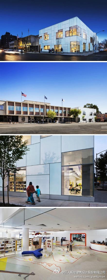 本案占地275000平方英尺,由1100Architect设计。建筑外观是由四种不同颜色的玻璃修饰,增加了图书馆在周围建筑以及街道上的曝光率,是一个很特别的建筑特色。馆内设计要求阔敞,空气清新,使用节能灯以及有效的能源节能,完成低消耗,无污染的目标。